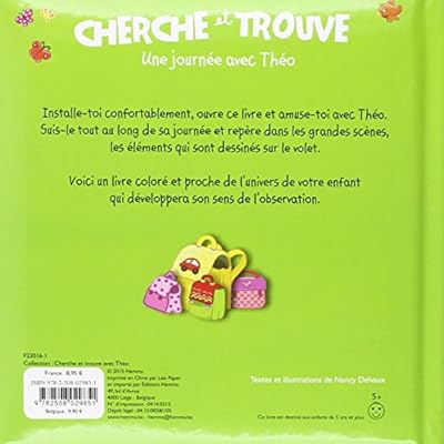 Concept amusant et valorisant pour les tout petits qui vont ainsi exercer leur sens de l'observation et pouvoir retrouver dans l'image tout ce qui leur est demandé. Chaque page de ce livre se déplie et augmente ainsi la surface de la scène grâce à son grand rabat. Chaque page aborde un moment de la journée de Théo et propose à l'enfant, grâce à un jeu d'observation, de retrouver tel ou tel élément dans une scène fouillée. Grâce aux illustrations douces et colorées, l'enfant va pouvoir aiguiser son sens de l'observation.