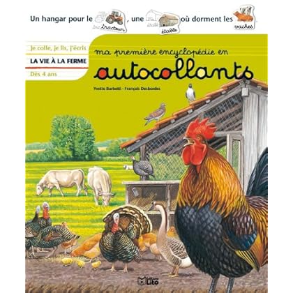 Comment le fermier trait-il ses vaches ? Quels bâtiments trouve-t-on à la ferme ? Qu'est-ce qui pousse dans le potager et dans le verger ? Qui se promène dans la basse-cour ? Une encyclopédie qui nous fait découvrir la vie à la ferme avec tendresse. Un album souple comprenant deux pages d'une quarantaine d'autocollants repositionnables et présentés en désordre. Un thème abordé de façon simple en 9 questions. Réponse en cinq lignes avec des mots, illustrés par des vignettes au trait, sur lesquelles l'enfant vient coller l'autocollant-couleur correspondant. L'enfant peut ainsi aiguiser sa curiosité et développer sa capacité à lire, écrire, reconnaître, chercher et coller tout en s'amusant.